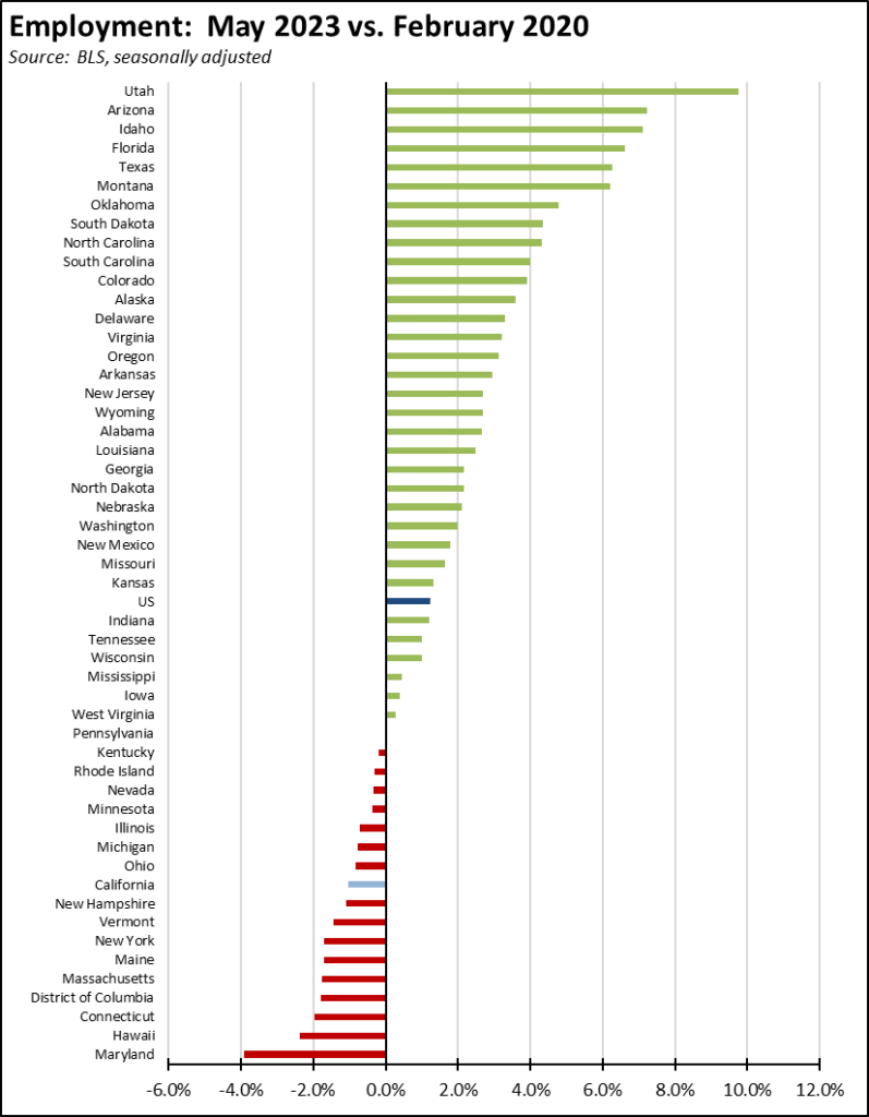 Compared to the pre-pandemic peak in February 2020, California’s continued weak employment recovery edged the state’s ranking down to 42nd highest among the states and DC.