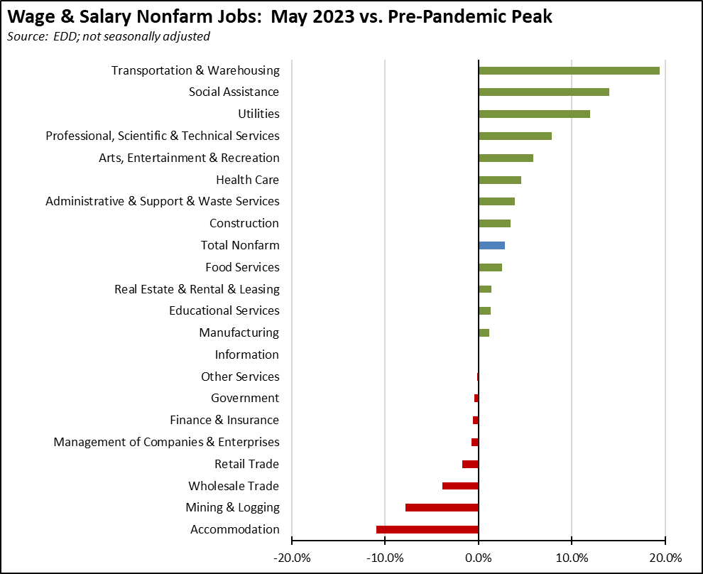 Using the unadjusted numbers to show a more detailed industry breakdown, blue collar, middle-class wage Transportation & Warehousing continues to show the strongest recovery compared to the pre-pandemic peak. As trade has been hampered by the ongoing labor negotiations and as state and local opposition to new warehousing has increased, these gains are quickly being made instead by Social Assistance—largely composed of government-funded and very low wage In-home Supportive Services (IHSS). Weakest recovery continues to be the blue collar, higher-wage jobs in Mining & Logging targeted by state policy for reductions and in the lower-wage Accommodation jobs that were heavily impacted by the state shutdown policies.