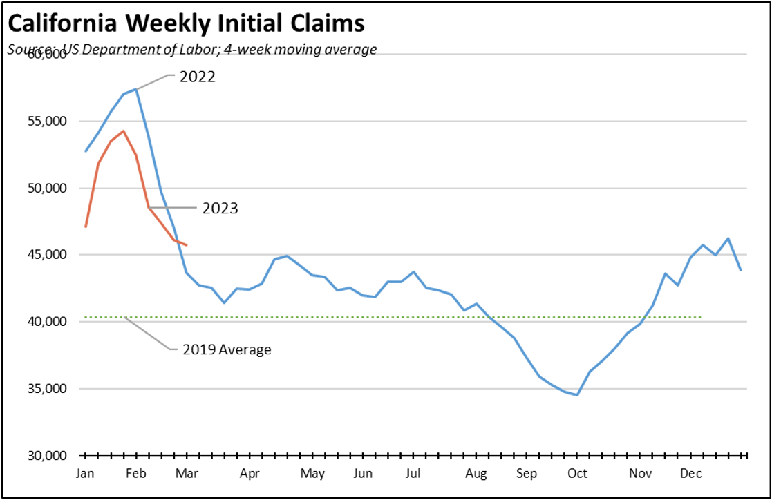Initial unemployment claims in California saw a sharp rise in the week ending March 4, rising 26% from the previous week to 51,026. On a 4-week moving average basis, however, initial claims are generally following last year’s trend and at a reduced level.