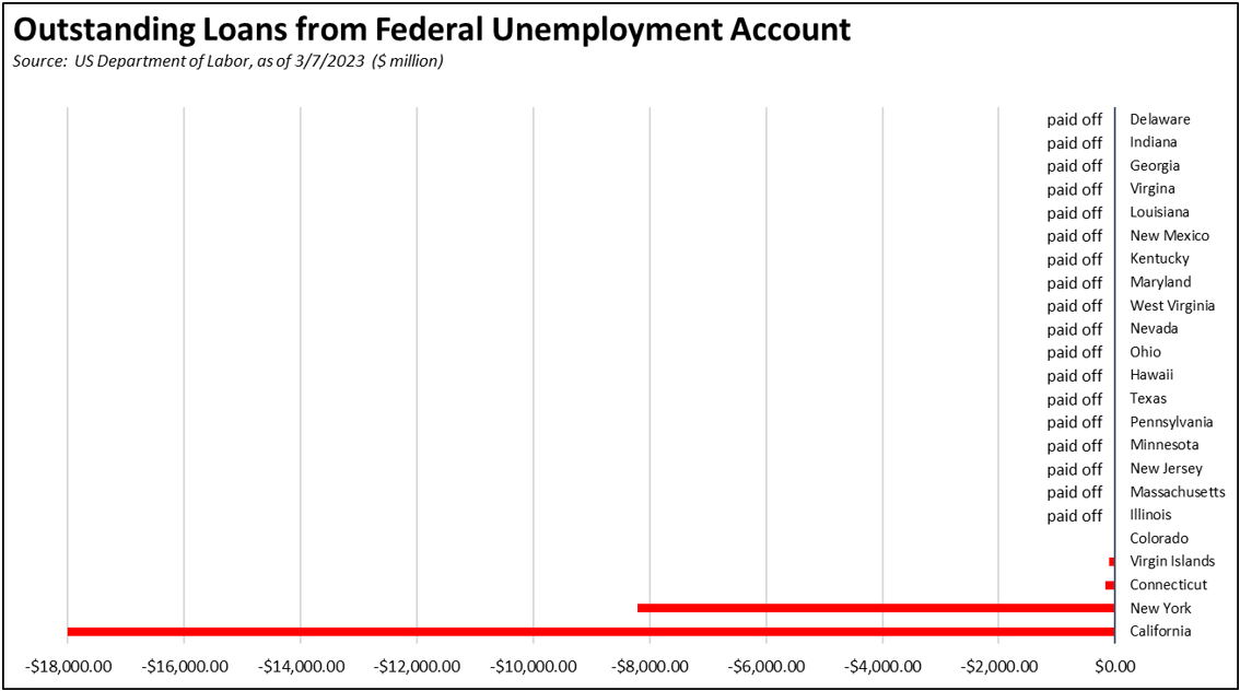 With almost all of the other states paying off their pandemic debt—including use of federal pandemic assistance funds specifically earmarked for this purpose—the remaining debt essentially comes down to California and New York. At $18.6 billion as of March 7, California accounts for 69% of the total.
