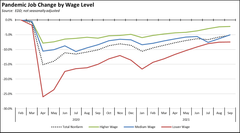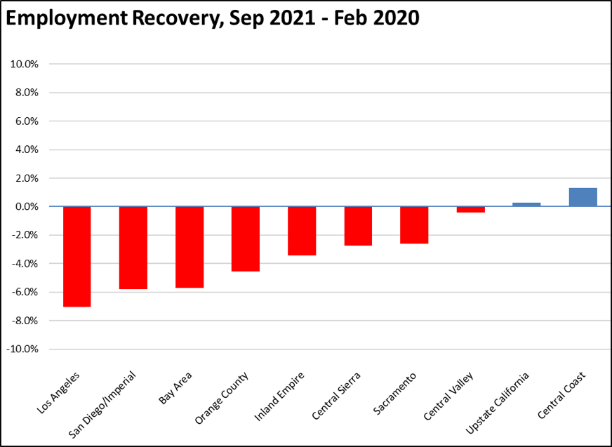 Comparing September employment to pre-pandemic February 2020, Los Angeles Region lagged behind the rest of the state, showing a loss of 7.0% and containing 44% of the total employment shortfall in the state compared to 29% of the total population. Central Coast and Upstate California moved into the growth category.