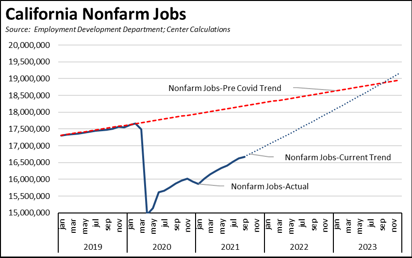 While most of the comparisons in this report and elsewhere measure recovery in terms of the pre-COVID levels in February 2020, the state lockdowns also shut off continued growth that would otherwise have occurred in the previous year and a half. Full recovery consequently should instead be considered by how long it will take for the state to return to trend. Continuing the rates experienced over the past 3 months would return nonfarm jobs and employment to pre-COVID trend levels in mid-2023.