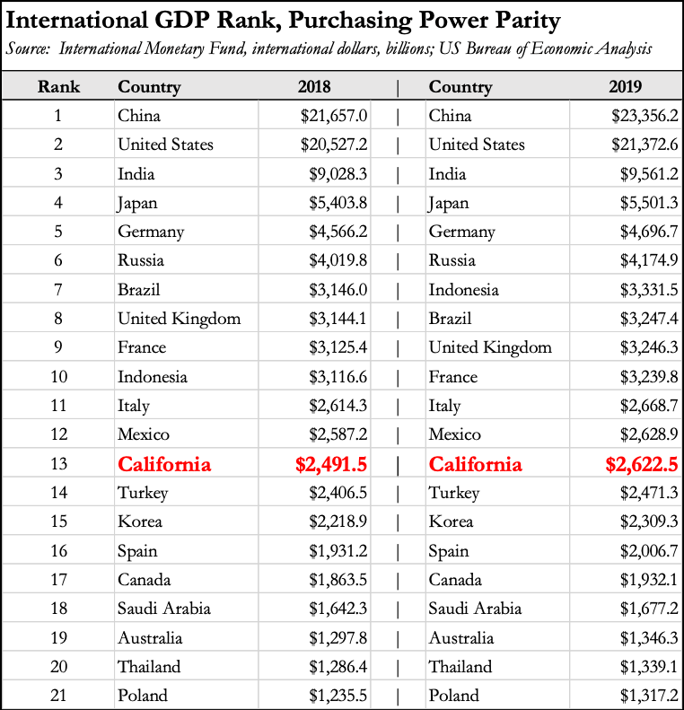 Data in the following table is consequently taken directly from the IMF numbers for the listed countries. The California entry again uses the Bureau of Economic Analysis data, but adjusts these numbers using the Bureau’s Regional Price Parity (RPP) series to calculate an equivalent purchasing power parity against the national total. RPP is currently available 2008 through 2019, but the results for 2020 will be provided once the updates and revisions are published in early December. While the results for 2019 are just short of a tie for 12th place with Mexico, the results indicate California has remained in 13th place throughout the period the RPP data is available.