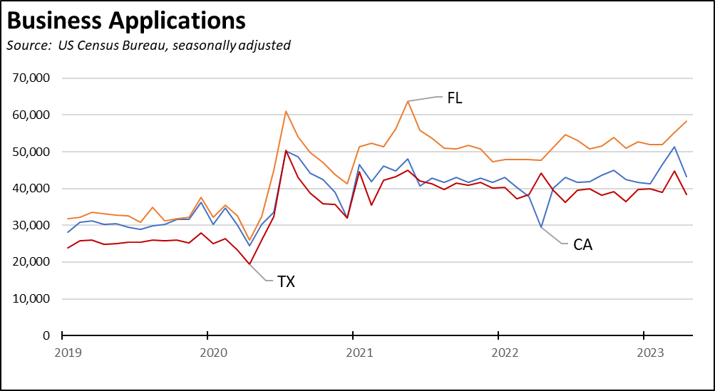 - As claimed, business license applications in April were up 46.6% since April 2022, but only because the comparison month of April 2022 posted the lowest level since April 2020 at the depths of the pandemic downturn. Using a more meaningful comparison, applications in the 12 months ending April 2023 were up 5.8% from the same period ending April 2022, still positive but avoiding the distortion coming from selective choice of the monthly data. More telling, the number of business applications in California has consistently lagged those in Florida since at least 2019, and has closely tracked those in Texas even though that state is only three-quarters as large.