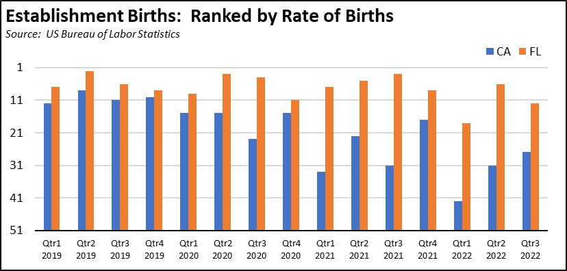 Given that the state contains 15.1% of all private establishments, it should be creating more of them in absolute terms, but in relative terms, other states are growing much faster. On a relative basis using the rate of establishment births, California ranks much lower, generally deviating little from the overall US average. In this period, California ranked from 8th to only 42nd highest. Florida in this same period ranged from 2nd to 18th highest and performed better than California in each quarter.