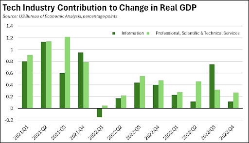 The weakening in state real GDP reflects the declining contribution coming from the tech industry in this period. Taking the two primary industries containing the tech employers, Information and Professional, Scientific & Technical Services contributed as much as 55% of California’s real GDP growth (1.8 percentage points of the 2.6% annualized growth) in the 3rd quarter of 2021, dropping to a low of -0.7% in Q2 2022 and only 12% in the latest Q4 2023 results (0.4 percentage point of the 3.1% growth). The strongest contributing industries in Q4 2023 instead were Manufacturing (0.85 percentage point), Retail Trade (0.51), and State & Local Government (0.35).