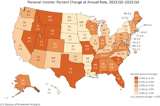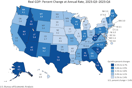 In Q4 2023, US Bureau of Economic Analysis reports that California real GDP rose 3.1% on an annualized basis, below the US average of 3.4% and 29th highest among the states. For 2023 as a whole, California real GDP rose 2.1%, below the US average of 2.5% and 32nd highest among the states.