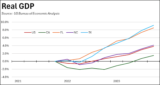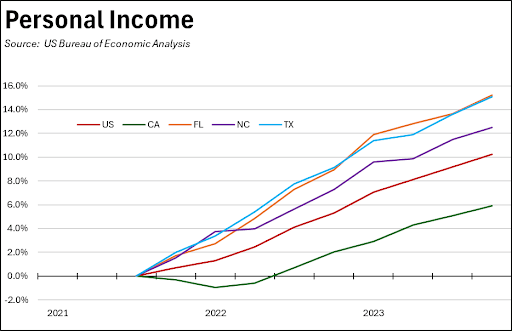 While the latest results show improvement, California’s sub-par GDP performance in 2022 and 2023 underlies much of the sharp drop in revenues the state is now experiencing. In the most recent data, California experienced recessionary conditions in 2022 and the first half of 2023. California real GDP dropped 2.1% over two consecutive quarters at the beginning of 2022, and did not recover until Q3 2023. Similar conditions are reflected in the US data as well, but the dip was much shallower and subsequent recovery stronger as was the case with the three states showing stronger jobs expansion than California in the post-pandemic period. Overall, California real GDP grew only 1.5% in the last 8 quarters, compared to 3.8% for the US, 4.1% for North Carolina, 8.5% for Florida, and 9.2% for Texas.