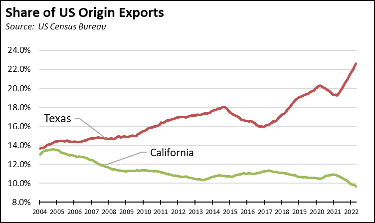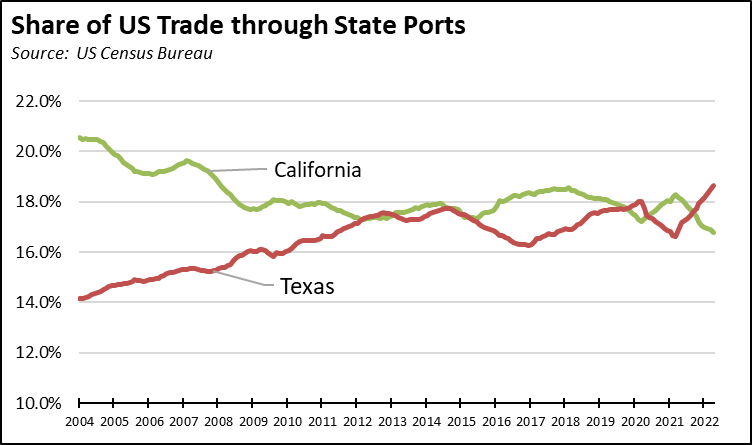 The revisions also had only a minor effect on the two metrics tracking the state’s relative position in trade. California, however, continued to lose ground to Texas as the number one state measured by both the total trade flow through state ports and share of total US exports.
