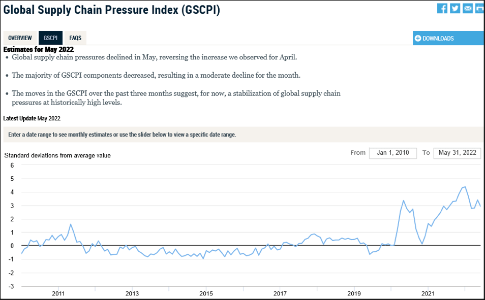 Overall, the New York Federal Reserve’s Global Supply Chain Pressure Index shows global conditions easing only slightly from peak congestion in December 2021. Global conditions have essentially leveled off in the past few months, but at historically high levels.