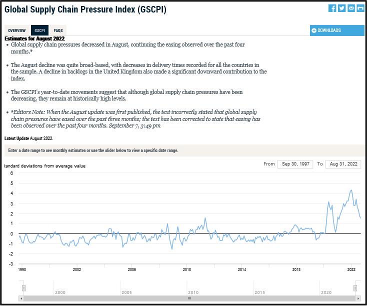 As measured by the New York Federal Reserve Global Supply Chain Pressure Index, supply congestion continued easing globally in recent months, still at substantially elevated levels but reflecting the current slow up in global trade and emerging recessionary pressures.