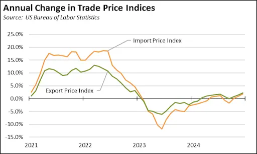 Using the Price Indices for End Use, All Commodities, not seasonally adjusted, trade goods saw minor inflationary pressures at the end of 2024, with import prices rising 2.2% over the year and export prices rising 1.8%. These increases, however, are minor compared to the supply-constraint driven price increases during the pandemic.
