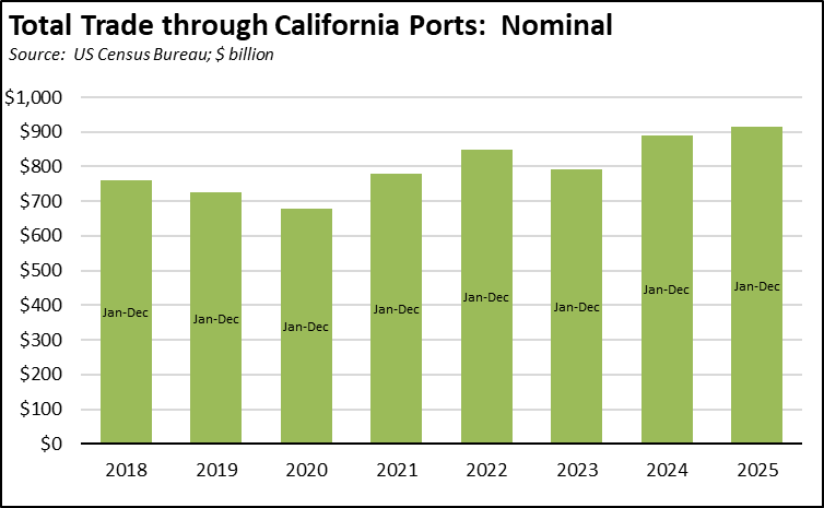 With the December numbers in, California posted new records for trade through the state’s ports measured in both nominal and real terms. California, however, remained in second place with 16.3% of total US trade volume, behind Texas with 19.9% and essentially reversing the relative shares held by each at the beginning of the 2000s.