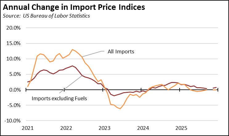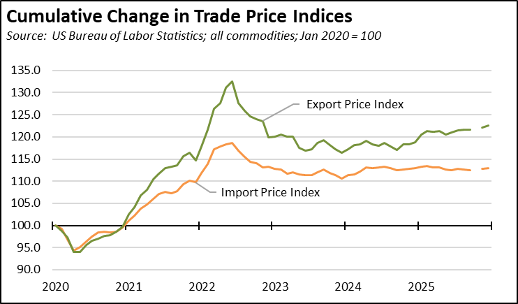 While import prices have recently held steady rather than dropping to accommodate tariff increases, December saw a 0.8% increase over the year for the less volatile imports excluding fuels index. Export prices continued to climb at essentially the same pace over the past 5 months.
