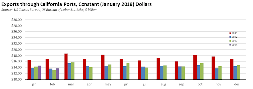 Measured in constant dollars, exports through California ports remain somewhat depressed, but still some improvement over the prior two years.
