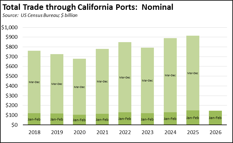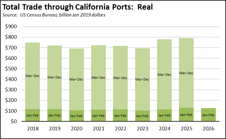 Reflecting the Lunar New Year holiday, total trade through the state’s ports dropped $9.0 billion (-11.5%) from January, but was essentially unchanged from February 2025. Measured in current dollars, total trade in the first two months was only marginally lower (-1.8%) than the same period in 2026, but was off 3.4% measured in constant dollars.