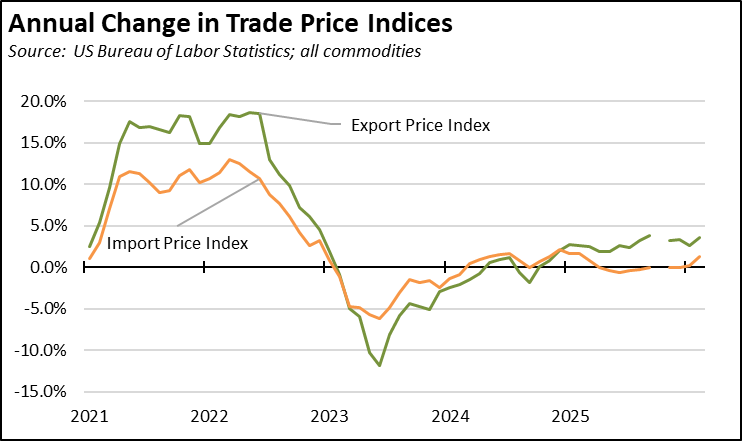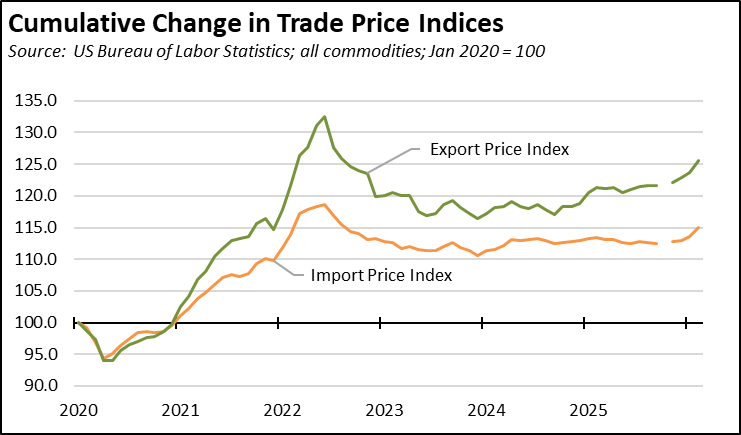 These results reflect a recent surge in import prices combined with the ongoing rise in export prices. At an annualized rate, import prices rose 16.3% in February, the highest level since 2022. Export prices were higher at an annualized rate of 20.2%, also the highest since 2022.