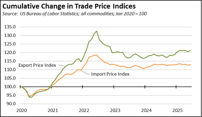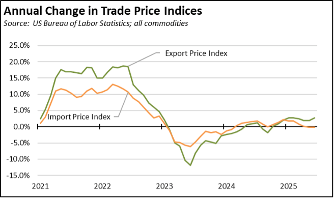 Export price levels have seen some growth in the past few months, but both exports and imports overall have shown little change so far this year. Note that previous versions of the Annual Change chart below were mislabeled and have been corrected in this version.
