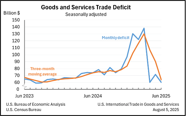 Trade statistics in June again were buffeted by tariff policy shifts, with the latest deadline for tariff agreements now set for August 7. Trade levels consequently have been affected more by timing decisions attempting to beat the latest deadlines rather than pure economic considerations. For example, the dramatic shift in imports between the first and second quarters was more a redistribution of when those imports took place rather than a shift in the overall levels. This factor continued in June, when nationally the goods and services trade deficit fell 16.0% as exports eased more slowly (-0.5%) than imports (-3.7%). With the number of trade agreements ramping up, a level of certainty if not yet stability is beginning to enter the trade picture, but the outcome of this week’s latest deadline along with other recent moves such as the announced intention to impose secondary tariffs related to Russia will shed more light on expected trade levels during what would normally be the holiday shipping peaks. The trade uncertainty, however, has yet to have substantial effects on the economy including jobs and prices, particularly as many companies to date have absorbed much of the resulting costs and as reshoring investments in many cases remain premature given this continuing uncertain investment climate. As additional agreements are completed and the longer-term cost picture becomes more apparent, both of these outcomes are likely to change, with some additional tariff costs passed onto customers and investments again being assessed with at least this source of risk narrowed.