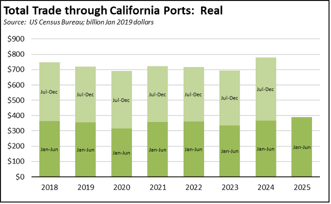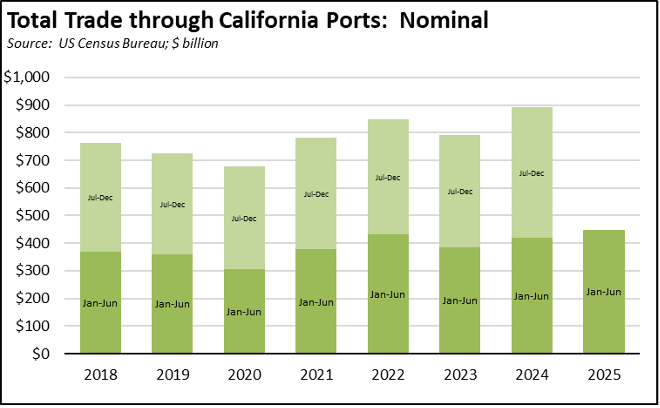 Total California destination goods imports fell $1.7 billion from June 2024 (down 3.9%).