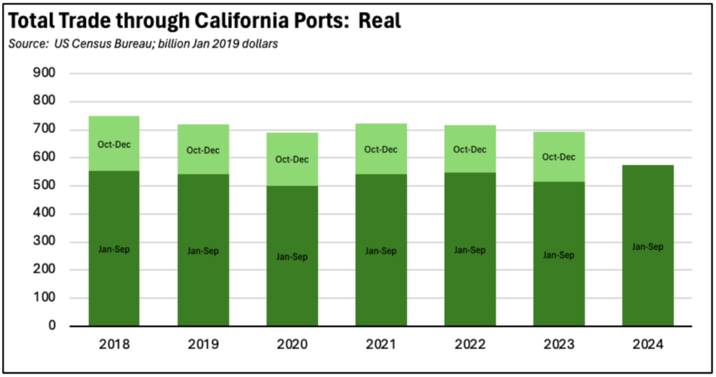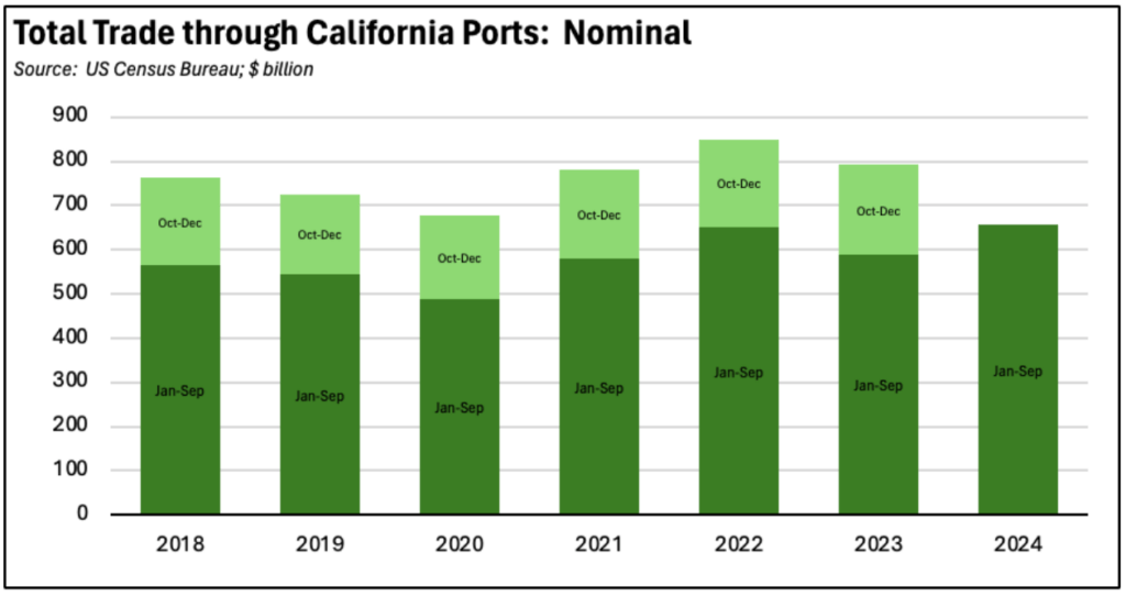 For California, the September numbers overall came in at strong levels as normal trade activities were affected by labor issues at other ports along the East and Gulf Coasts and in Canada. Origin exports rose 5.9% in nominal terms above the same month a year ago, while total trade through the state’s ports rose to 17.4% of the national total for the month and 16.3% on a 12-month moving average. Trade volumes also reflected continued efforts by shippers to get ahead of expected port closures as well as anticipated tariff increases in the next administration.