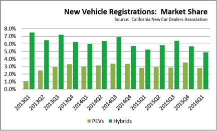 - PEVs and Hybrids combined dropped to 7.6% in Q1 2016 compared to 8.8% in 2015 and the previous high of 9.5% in 2013. Rather than bringing in a wider base of customers, increased PEV sales in part are coming from a shift of the same customer base now willing to buy a PEV instead of a hybrid as additional models have become available.