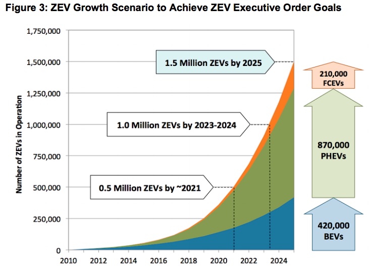 As part of the AB 32 climate change program, Executive Order B-16-2012 administratively created a goal of 1.5 million zero-emission vehicles (ZEVs) on California roads by 2025, with a sub-goal that their market share is expanding at that point. The order also established interim mileposts primarily related to infrastructure support for recharging along with more qualitative targets for manufacturing capacity and commercial viability of these vehicles.