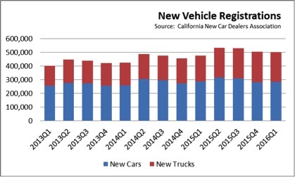 - As fuel prices have declined from the $4 a gallon level and higher in 2013 and 2014, consumers’ buying preferences have shifted back more to light trucks. Similar to the national pattern, new car registrations were down 2.0% in 2016 Q1, while light truck registrations were up 12.5%. Overall, market share for new cars declined from 63% at the beginning of 2013, to 56.6% in Q1 2016. Light trucks went from 37% to 43.4%.