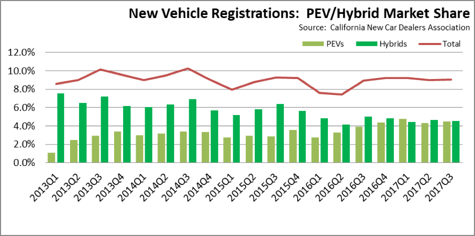 - 2017:Q3 PEV sales (plug-in hybrids and battery electric vehicles) at 23,336 vehicles, up 11.3% from 2016:Q3. Total market share for PEVs was 4.5%, up from 3.9% in 2016:Q3.