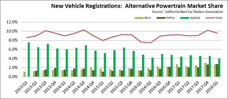 - Hybrid sales (except for plug-in hybrids) at 19,416, down from 22,328 in 2017:Q1. Total market share was 4.0%, down from 4.4% in 2017:Q1.