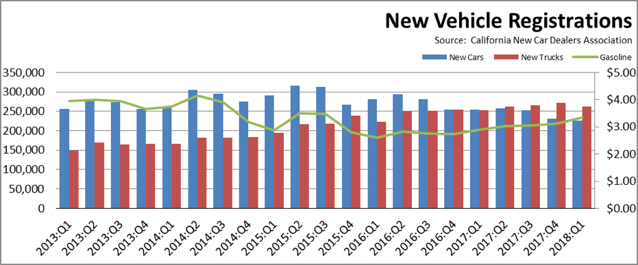 - The trend towards light trucks came even in spite of higher fuel prices. The average California price for regular gas in Q1 2018 was $3.34 a gallon, compared to $2.89 the year prior.